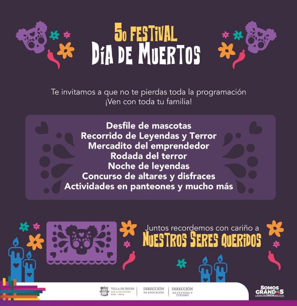 El presidente municipal de Villa de Reyes, Daniel Lagunas López anunció la Quinta Edición del “Festival de Día de Muertos” que se llevará a cabo del 29 de octubre al 2 de noviembre, y en el que se esperan alrededor de 10 mil asistentes que podrán disfrutar de diversas actividades artísticas y culturales, siendo una tradición en México.
