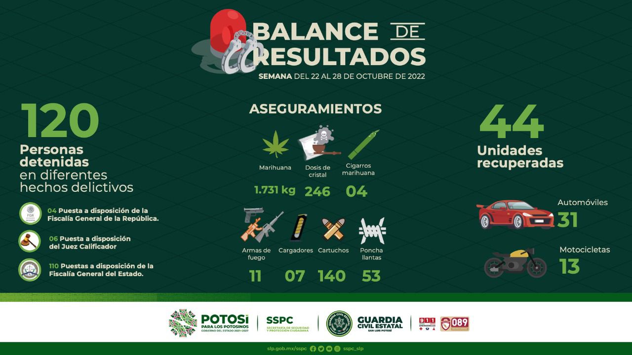 Derivado de la implementación del Plan Integral de Seguridad y sus estrategias en los 58 municipios de San Luis Potosí, para el combate frontal contra la delincuencia en todas sus modalidades, en el periodo comprendido del 22 al 28 de octubre del año en curso, 120 personas resultaron detenidas por la Guardia Civil Estatal, varias de ellas reincidentes y consideradas como objetivos criminales generadoras de violencia.
