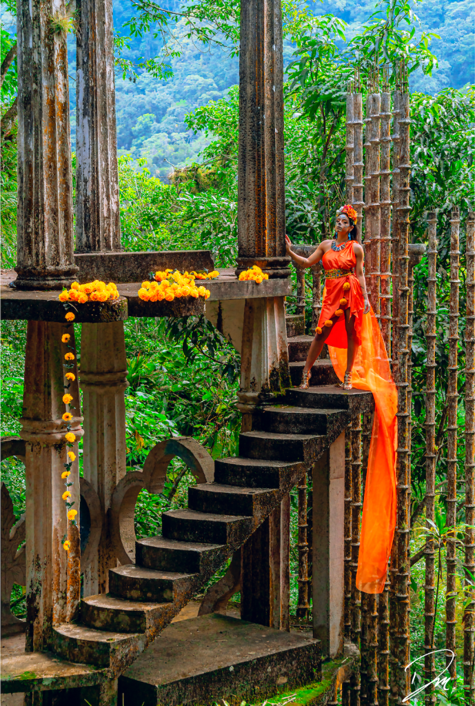 Las imágenes fueron tomadas en el Jardín Escultórico Edward James, Las Poza, ubicado en el pueblo mágico Xilitla. Su musa muestra las hermosas tradiciones de día de muertos al ser presentada como una catrina en un espacio surreal. Con ella también hace gala de otro orgullo del Estado, Jessica Parrilla es una joven atleta, modelo y actriz que demuestra el semillero talento que nace en San Luis Potosí.