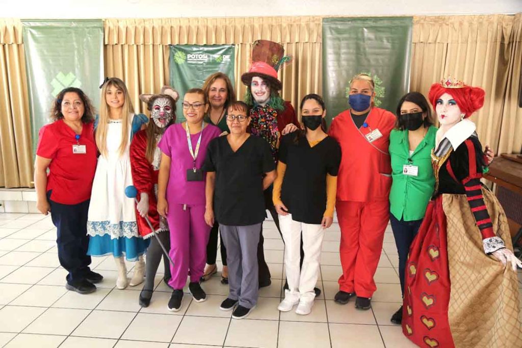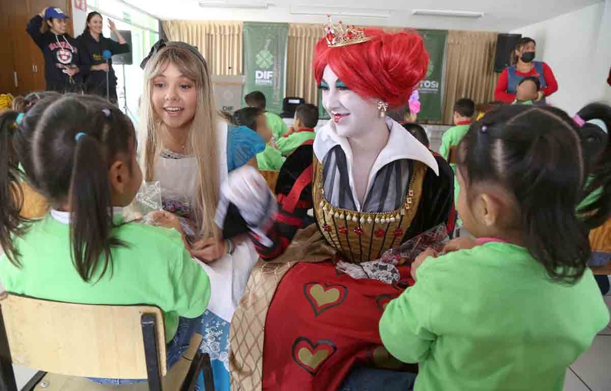 Gracias a la política social del Gobernador de San Luis Potosí, Ricardo Gallardo Cardona, y las gestiones de Ruth González Silva, presidenta honoraria del DIF, las y los menores fueron acompañados de los personajes de la historia “Alicia en el País de las Maravillas”, quienes llevaron a cabo juegos, dinámicas y la entrega de dulces como parte simbólica de la tradición de “pedir calaverita”.