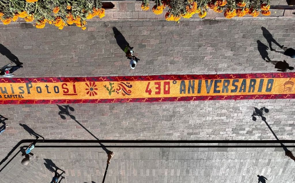 La Capital de San Luis Potosí se vistió de fiesta por los 430 años de su Fundación, por lo que el alcalde capitalino, Enrique Galindo Ceballos, inauguró el tapete monumental en Plaza de Armas y encabezó la recepción oficial de la escultura de San Luis Rey de Francia en Palacio Municipal.