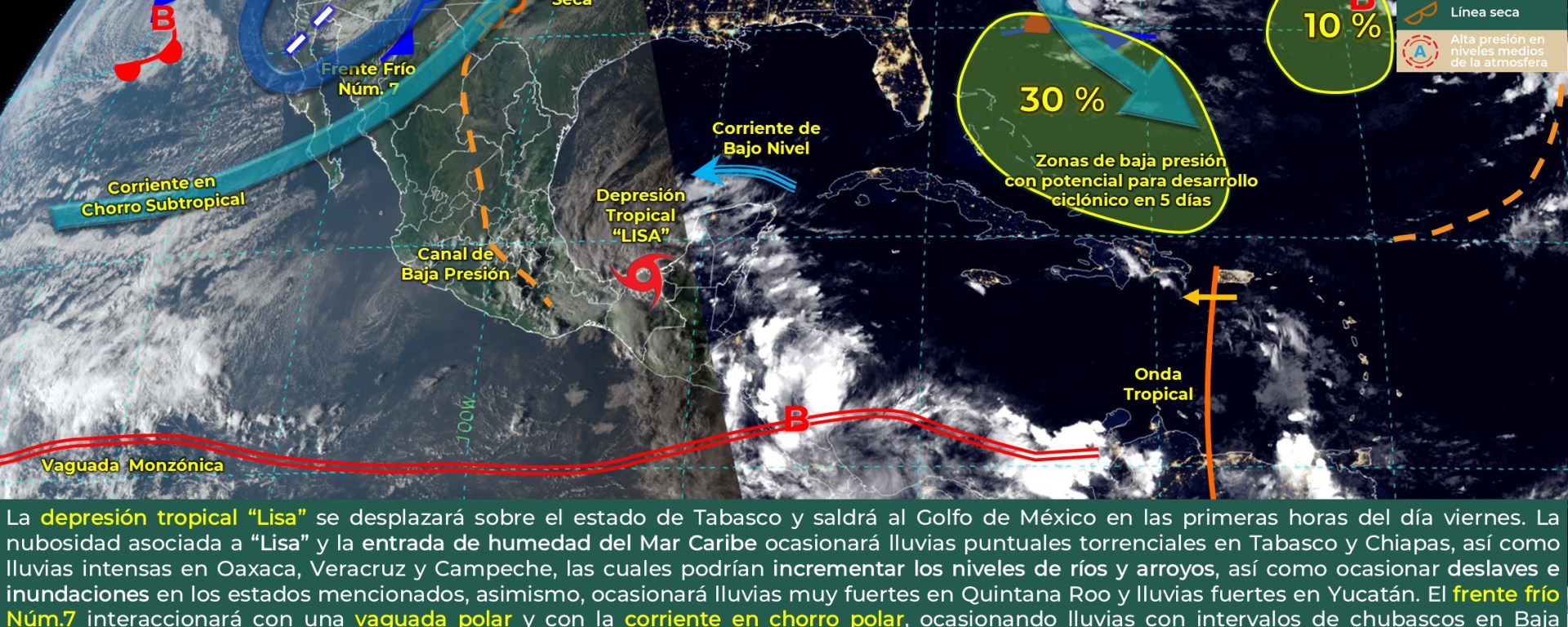 Intervalos de chubascos (5 a 25 mm): Tamaulipas, Michoacán, Guerrero, Ciudad de México, Estado de México, Morelos, Puebla, Yucatán y Quintana Roo.