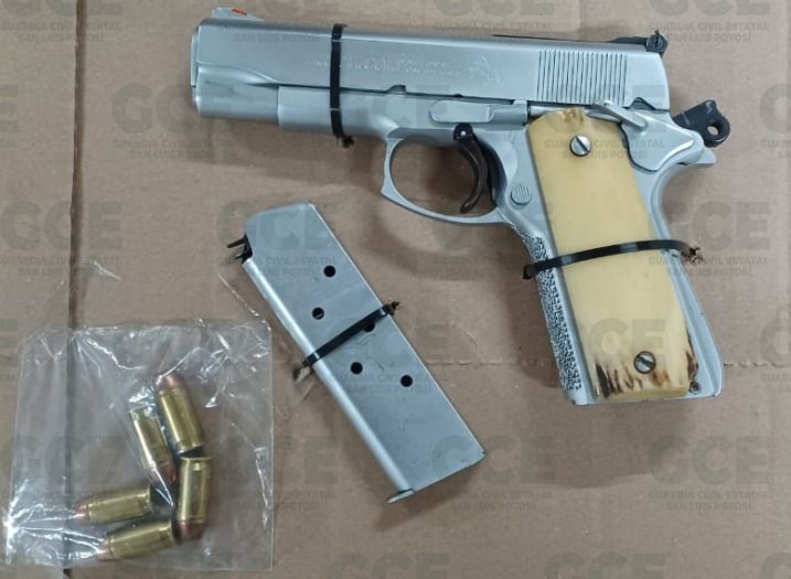 Los oficiales de la GCE aplicaron los protocolos de seguridad y mediante comandos verbales, lograron desarmar al sujeto. Guillermo de 57 años de edad fue informado del motivo de su detención tras atentar contra las fuerzas del orden, asegurándole un arma de fuego tipo escuadra, calibre 45 mm. con cinco cartuchos útiles; así como cinco bolsitas con marihuana y cuatro dosis de “cristal”, en su empaque llevaban letras de una presunta organización delincuencial. La camioneta Chevrolet, tipo Silverado, modelo 2003, sin placas de circulación, también fue asegurada.