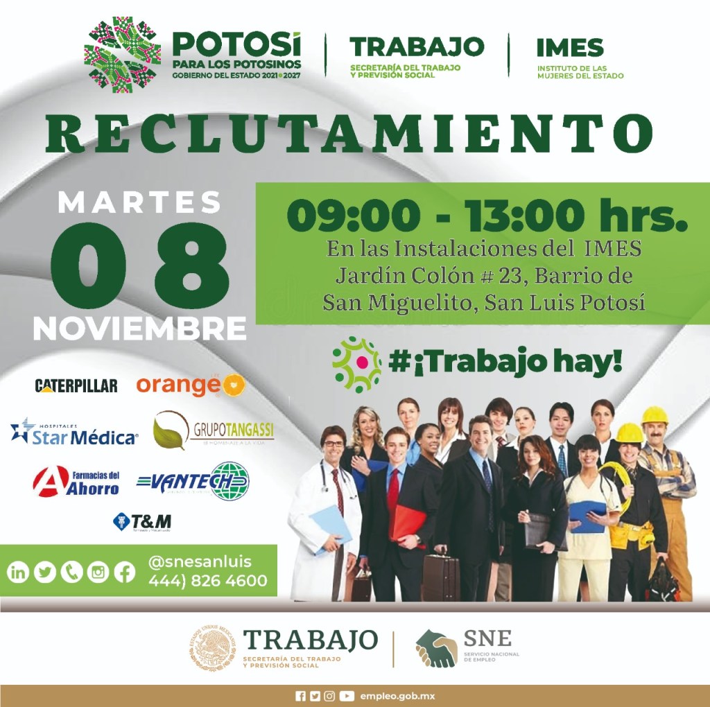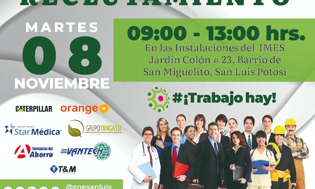 El próximo martes 8 de noviembre, el Instituto de las Mujeres del Estado (Imes) realizará la sexta “Jornada de Reclutamiento” para las y los potosinos de la zona metropolitana, en coordinación con la Secretaría del Trabajo y Previsión Social (STPS) y el Sistema Nacional del Empleo (SNE), en donde se ofertarán oportunidades de empleo por parte de empresas instaladas en la entidad, atendiendo con ello la prioridad del Gobernador de San Luis Potosí Ricardo Gallardo Cardona, de abrir oportunidades de desarrollo para todas y todos.