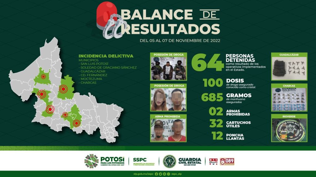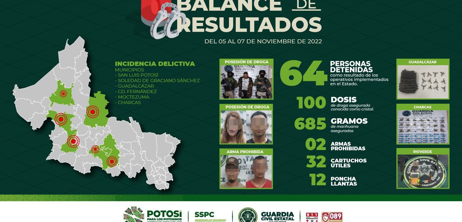 Como resultado de los operativos de vigilancia y actuación permanente y estratégica del Plan Integral de Seguridad, desplegado en todo el Estado potosino por la Guardia Civil Estatal, este fin de semana se detuvieron a 64 personas por su presunto involucramiento en diferentes hechos delictivos.