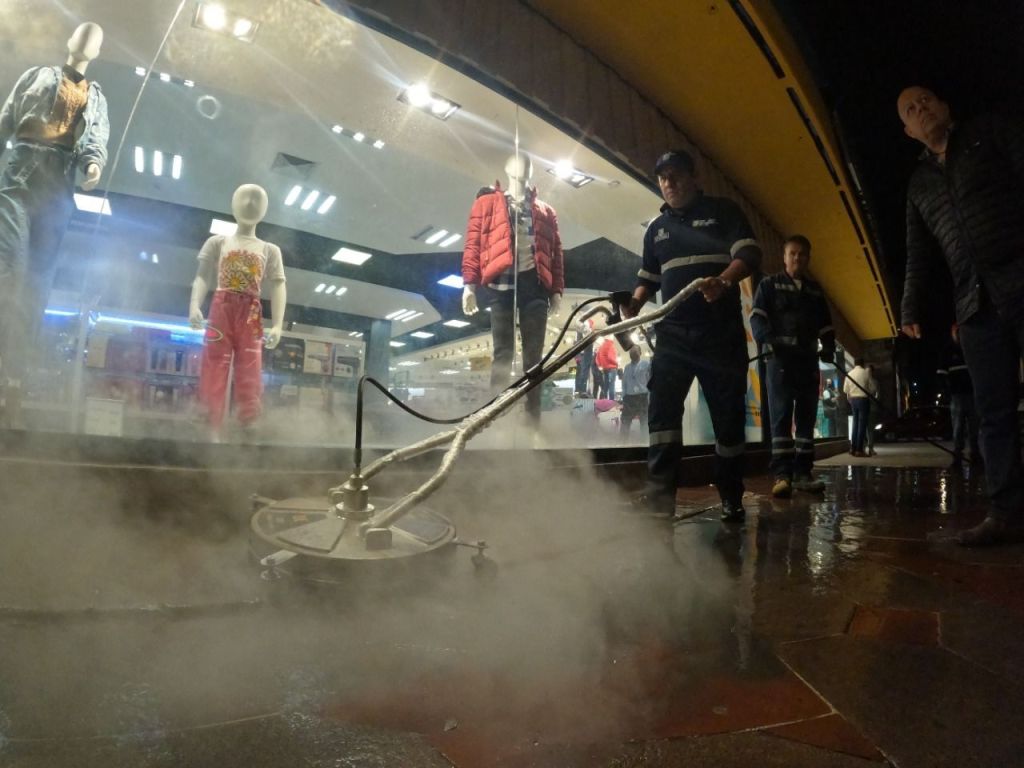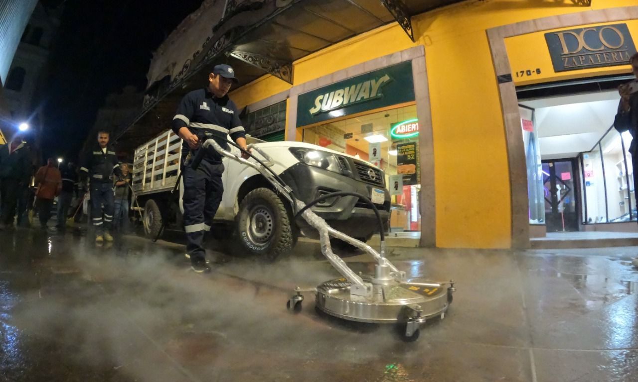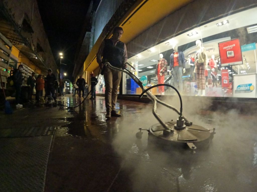 “Ante las dificultades que se tenían para limpiar el piso del pasaje Hidalgo, que, a pesar de recibir limpieza con agua a presión, tenía un beneficio mínimo, se tomó la decisión de adquirir una nueva máquina de limpieza que funciona con compresora y una caldera de temperatura alta, que consigue el retiro del 95 por ciento de suciedad”, explicó el director de Servicios Municipales, Christian Azuara Azuara.