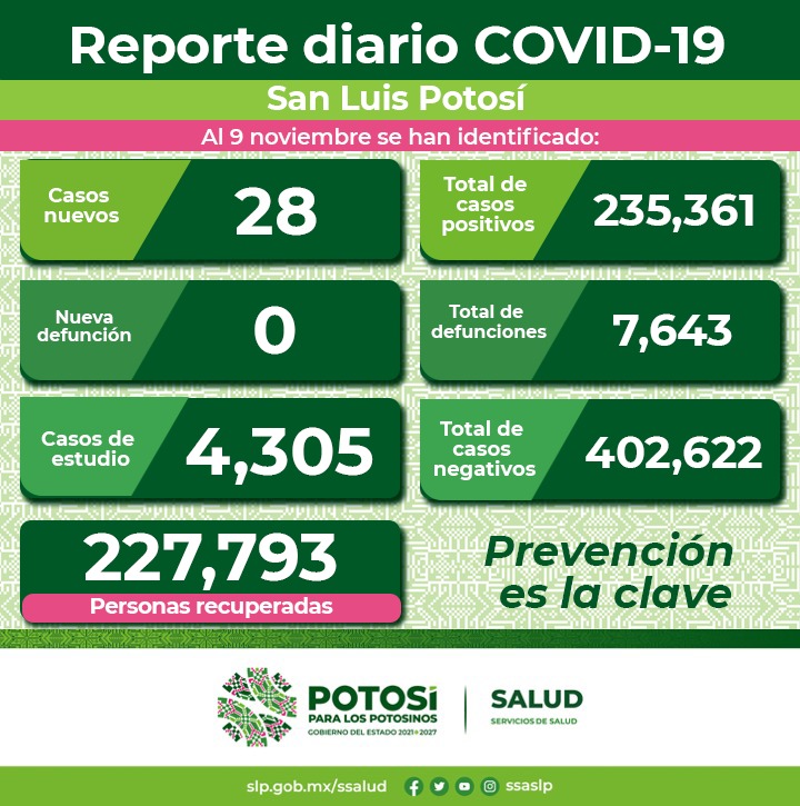 28 nuevos casos detectados en la Jurisdicción Sanitaria I, 26 en la capital y dos, en Soledad de Graciano Sánchez; no se presentaron casos nuevos en personas residentes de otra entidad, así como en las siguientes jurisdicciones sanitarias, II de Matehuala, III de Villa de Pozos, VI de Rioverde, V de Ciudad Valles, VI de Tamazunchale y VII de Tancanhuitz.