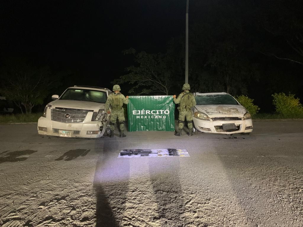 Tras labores de rastreo e inspección se confirmó el aseguramiento de una camioneta color blanco (con blindaje artesanal) y un vehículo tipo sedan, ambos tenia evidencia de que habían colisionado, cabe señalar que dichos automotores, en su interior contenían lo siguiente: