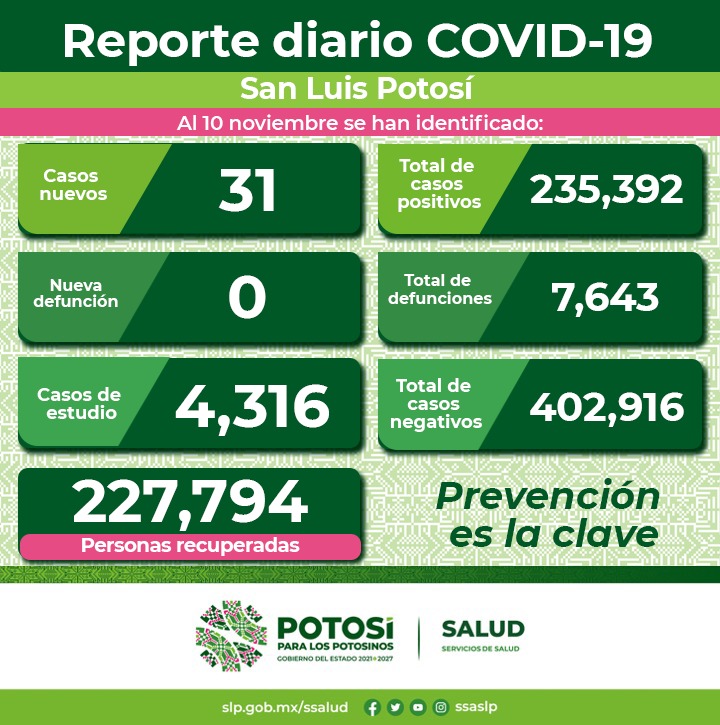 29 nuevos casos detectados en la Jurisdicción Sanitaria I; dos en la Jurisdicción Sanitaria V de Ciudad Valles; no se presentaron casos en las siguientes jurisdicciones sanitarias, II de Matehuala, III de Villa de Pozos, VI de Rioverde, VI de Tamazunchale y VII de Tancanhuitz, así como en personas residentes de otra entidad.