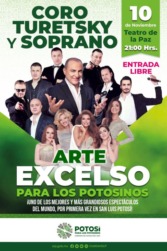 Resultado del impulso a la cultura y a las diversas expresiones artísticas por parte del Gobierno del cambio que encabeza el Jefe del Ejecutivo Estatal, Ricardo Gallardo Cardona, este jueves 10 de noviembre a las 21:00 horas, el Teatro de la Paz presentará un espectáculo de calidad mundial, con la presentación del grupo artístico Coro Turetsky y Soprano, que ofrecerá un espectáculo vocal fuera de serie y que dejará gratamente impresionados a las y los asistentes.