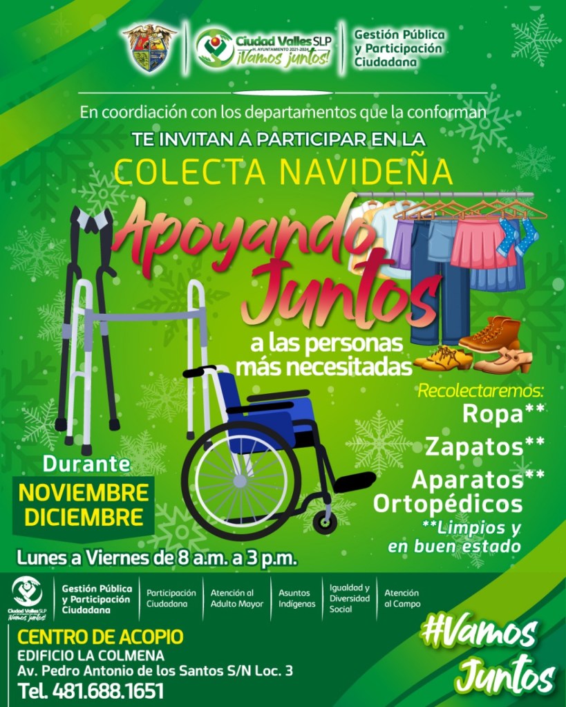 Sandra Rivera Sánchez, Directora General de Gestión Pública y Participación Ciudadana del ayuntamiento vállense, señaló que en apego a las políticas públicas implementadas por el Presidente Municipal David Armando Medina Salazar de buscar el como sí, sumar esfuerzos y apoyar a las familias en situación vulnerable, se tomó la decisión de instalar un centro de acopio para la recepción de ropa, zapatos y aparatos ortopédicos de segunda mano.