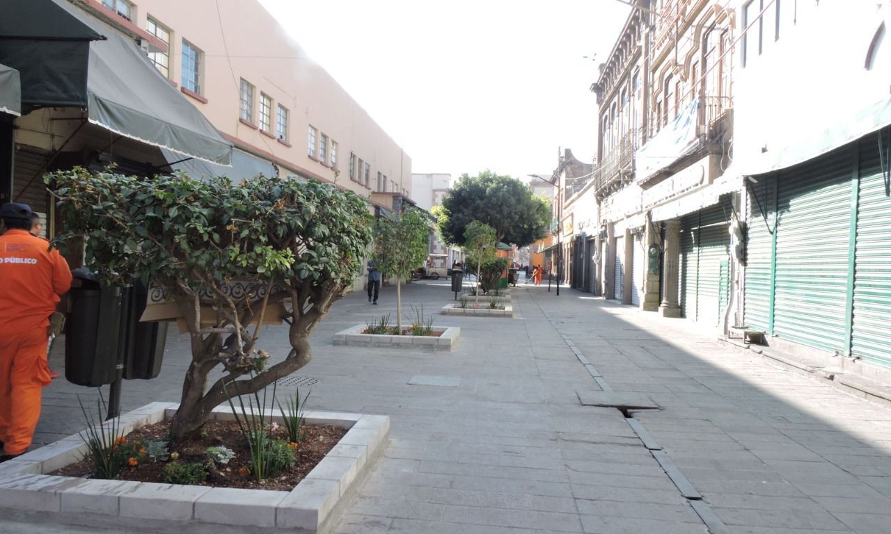 Se aplica pintura en las fachadas, se rehabilitan jardineras y se recupera el color original del piso de cantera roja en la calle Hidalgo.