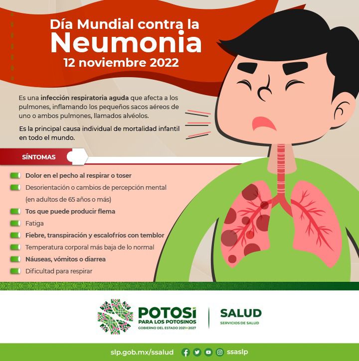 El 12 de noviembre es el “Día Mundial contra la Neumonía”, cuya conmemoración tiene como objetivo incrementar la visibilidad y crear conciencia en la población sobre sus riesgos, causas y sobre todo dejar en claro que se puede prevenir y es curable tras un diagnóstico y atención oportuna.