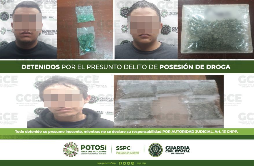 Por último, en el municipio de Soledad de Graciano Sánchez, sobre carretera 57 y calle Zaragoza en la colonia La Constancia, policías de la GCE detuvieron a Juan de 32 años de edad por presunta posesión de 5 bolsitas con una hierba verde y seca con las propiedades físicas de la marihuana.