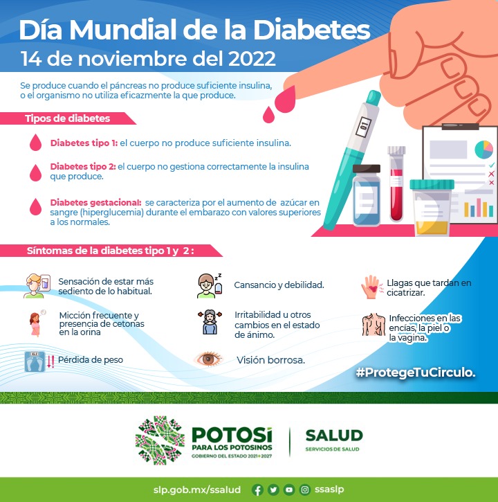 Para crear conciencia sobre el impacto de la diabetes en la salud de las y los potosinos, así como difundir temas de interés para los pacientes que viven con esta enfermedad, se conmemora cada 14 de noviembre el Día Mundial de la Diabetes; en lo que va de este 2022, en los centros de Salud de los Servicios de Salud del Gobierno del Estado se han realizado más de 58 mil detecciones a personas de 20 años y más con factores de riesgo para desarrollar la enfermedad, han ingresado a tratamiento a 1 mil 115 personas.
