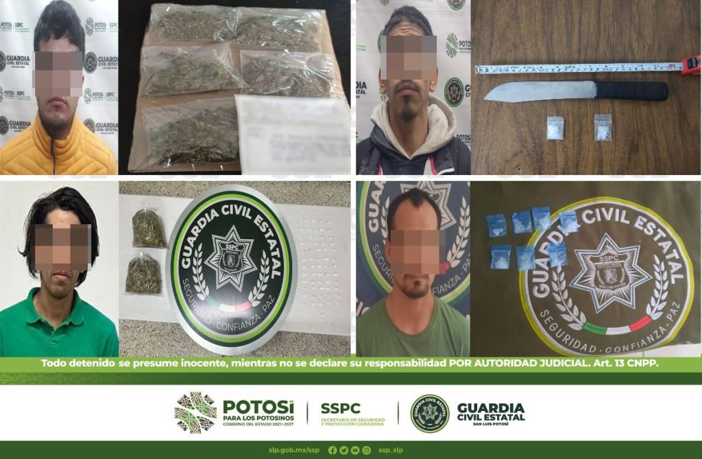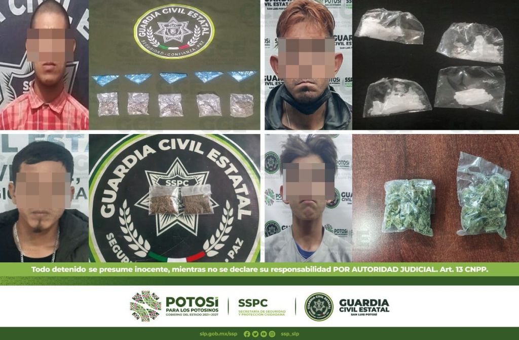 Derivado de los despliegues de seguridad y vigilancia desdoblados en todo el Estado de San Luis Potosí, en distintos hechos, oficiales de la Guardia Civil Estatal (GCE) detuvieron a 13 masculinos por presunta posesión de droga y aseguraron más de 100 dosis de enervantes.