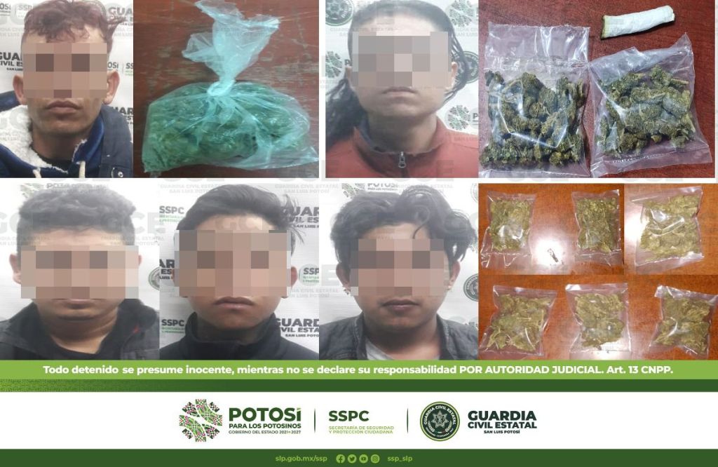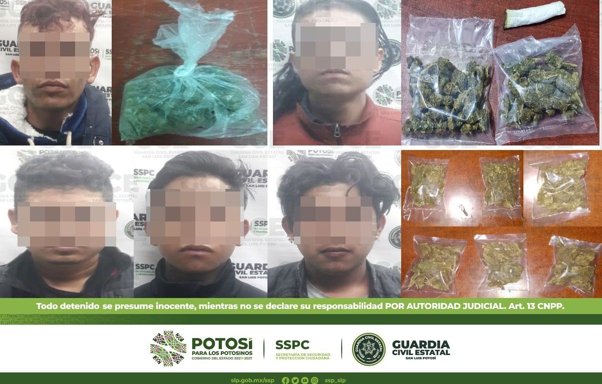 A su vez, en el municipio de Soledad de Graciano Sánchez, fueron detenidos 6 masculinos; uno de ellos sobre carretera Matehuala y la calle Hidalgo en la zona centro; Pedro de 32 años de edad se le aseguraron cuatro dosis de “cristal”. En avenida San Pedro y la calle República Dominicana en la colonia San Francisco, fueron detenidos Carlos de 25 años de edad, Martín de 18 y Heriberto de 20 años por supuesta posesión de 6 bolsitas de marihuana.