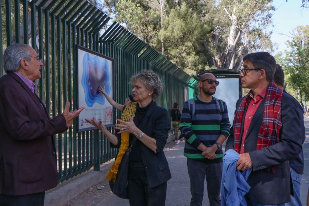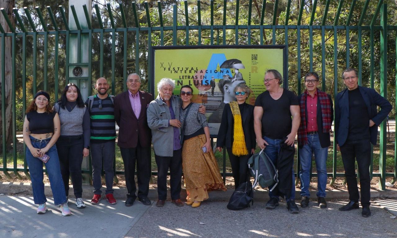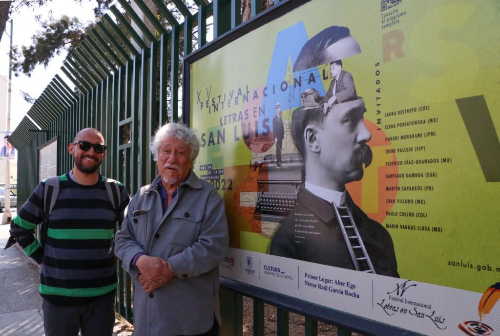 Poetas participantes del XV Festival Internacional Letras en San Luis recorrieron la muestra colectiva de diseño derivada del Concurso de Diseño Gráfico Letras en San Luis 2022, cuyo ganador fue el diseñador potosino Néstor Raúl García Rocha con el diseño “Alter Ego” inspirado en un poema del poeta colombiano Juan Manuel Roca.