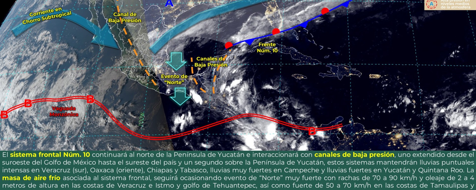 Evento de “Norte” con rachas de 60 a 80 km/h y oleaje de 2 a 4 metros de altura: costas de Tamaulipas, Veracruz e Istmo y Golfo de Tehuantepec, y con rachas de 50 a 60 km/h y oleaje de 1 a 3 metros de altura en la costa de Tabasco.