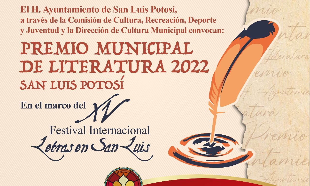 En el marco del Festival Internacional Letras en San Luis, la Dirección de Cultura Municipal y la Comisión de Cultura, Recreación, Deporte y Juventud, convocan a escritoras y escritores potosinos a participar en el Premio Municipal de Literatura 2022, el cual rinde homenaje a dos destacados escritores potosinos: Raquel Banda Farfán para Cuento y Félix Dauajare Torres para Poesía.
