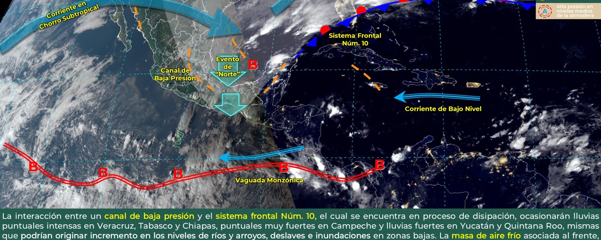 Viento de componente norte con rachas de 50 a 60 km/h: Istmo y Golfo de Tehuantepec, y rachas de 40 a 50 km/h en la costa sur de Veracruz.