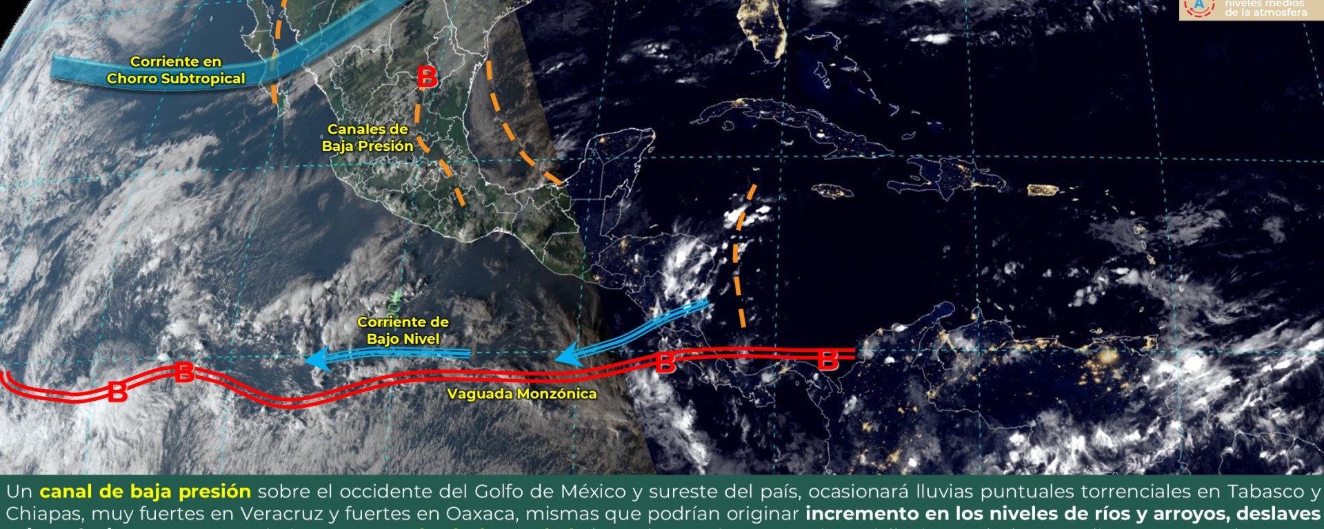 Intervalos de chubascos (5 a 25 mm): Coahuila, Nuevo León, Tamaulipas, Veracruz, Puebla, Hidalgo, Estado de México, Ciudad de México, Morelos, Michoacán, Guerrero, Oaxaca y Chiapas.