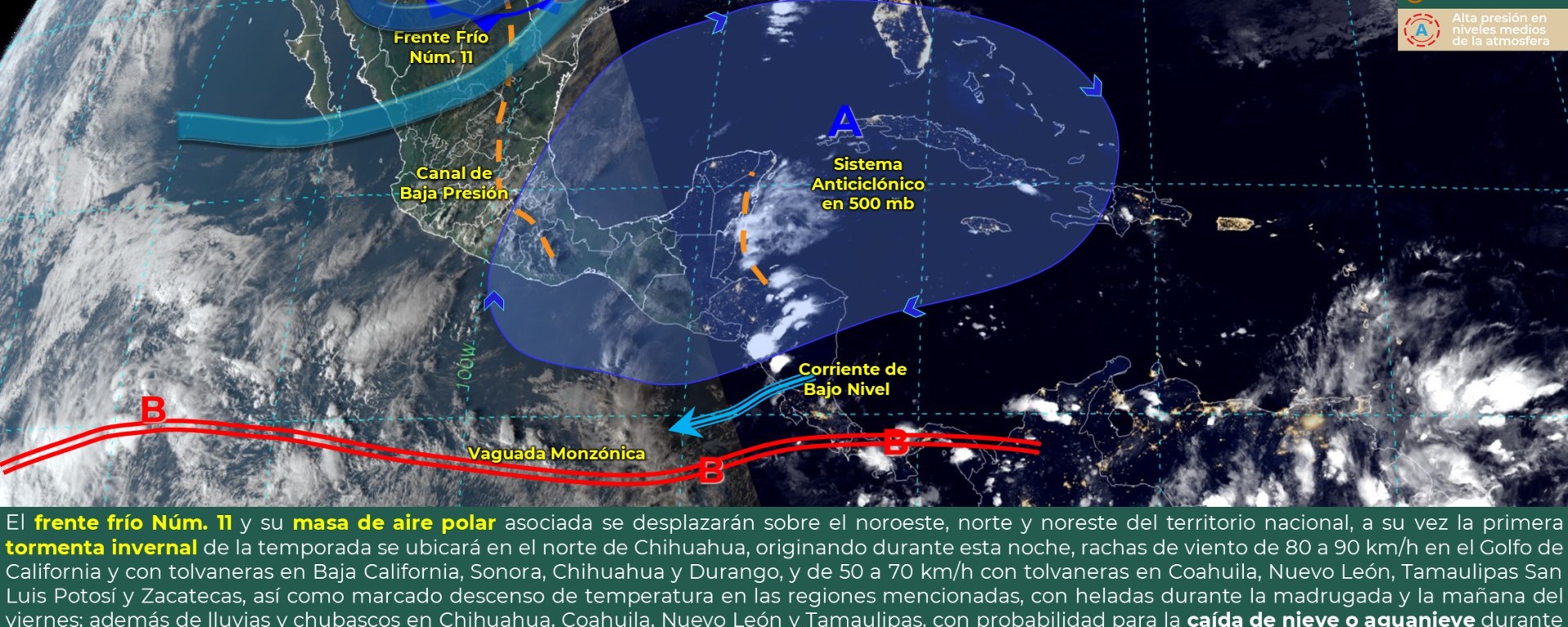Rachas de viento de 60 a 80 km/h: Golfo de California, con tolvaneras en Península de Baja California, Sonora, Chihuahua, Coahuila, Nuevo León y Tamaulipas.