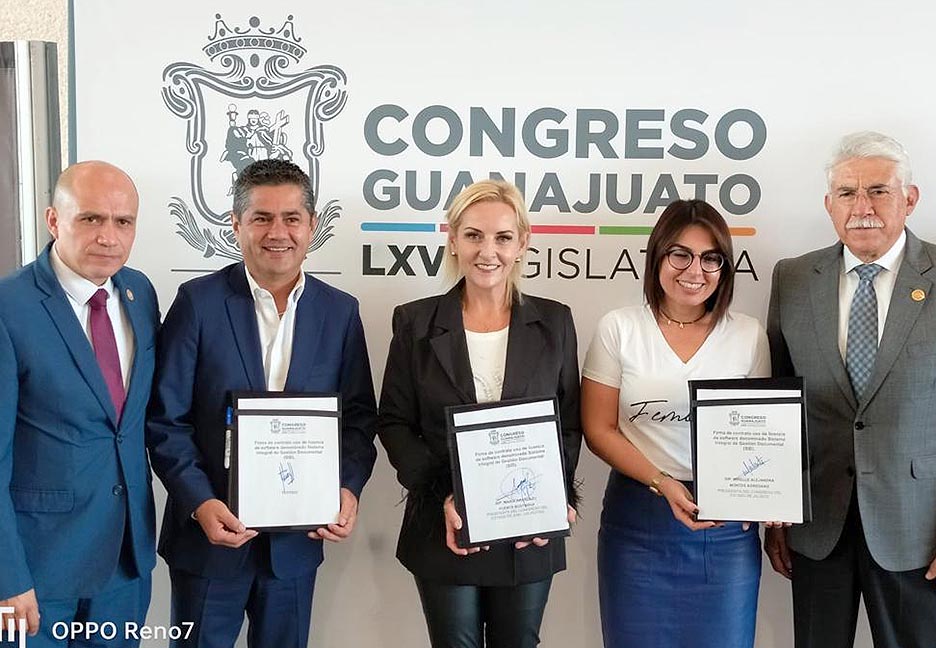 La firma del contrato de donación y entrega del Sistema Integral de Gestión Documental -SID- fue realizada por la diputada Aranzazu Puente Bustindui, presidenta de la Directiva del Congreso del Estado de San Luis Potosí y el diputado Martín López Camacho, presidente del Congreso de Guanajuato.