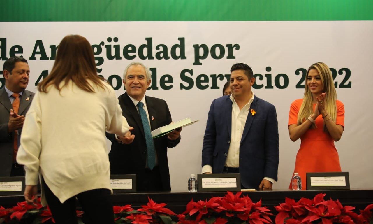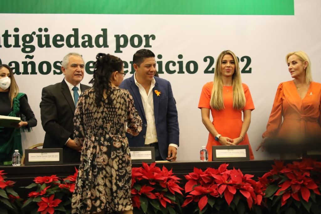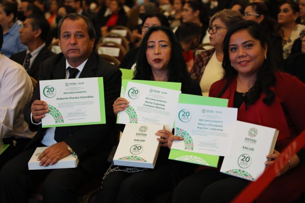 Tras brindar un agradecimiento a todas y todos los trabajadores de salud por su entrega y profesionalismo y al refrendar su compromiso con la atención médica de calidad a favor de las y los potosinos, el Gobernador de San Luis Potosí, Ricardo Gallardo Cardona, entregó reconocimientos y estímulos de antigüedad a personal médico, de enfermería, paramédico, de vectores, de supervisión, mantenimiento, administrativo y de otras ramas, por 20, 25, 30, 35 y 40 años de servicio.