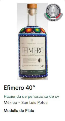 Respecto a los destilados, por cuarta ocasión, el Mezcal Júrame Reposado, de Mezcal Ipiña, que se ha convertido en un referente de los destilados elaborados en San Luis Potosí, ganó la Medalla de Oro; mientras que el artesanal Nobiliario y Efímero 40o, de Hacienda Peñasco, obtuvieron Medalla de Plata.