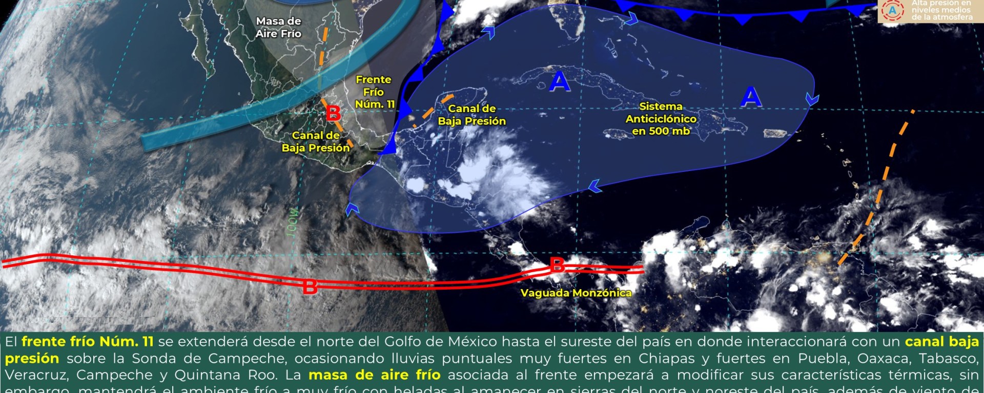 Intervalos de chubascos con lluvias puntuales fuertes (25 a 50 mm): Oaxaca, Veracruz, Tabasco, Campeche, Yucatán y Quintana Roo.