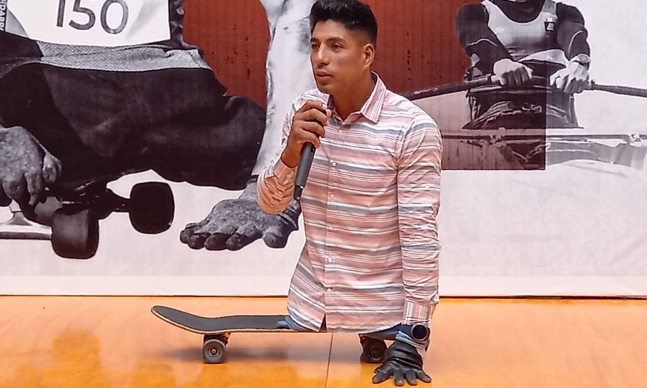 La cita era a las 11 de la mañana, teniendo como escenario, el patio de la Caja Real, y él llegó puntual. Michel Muñoz, atleta paralímpico de remo, quien representó a México en Tokio 2020, llegó con su patineta, sonriente, tranquilo.