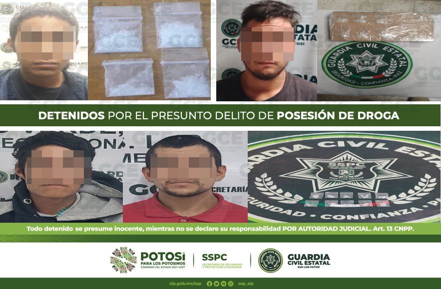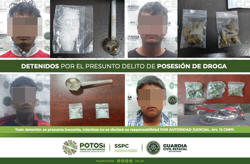 Como resultado de los operativos de seguridad y vigilancia implementados por policías de la Guardia Civil Estatal (GCE), para restaurar la paz en favor de las y los potosino, 8 personas resultaron detenidas por el presunto delito de posesión de droga.