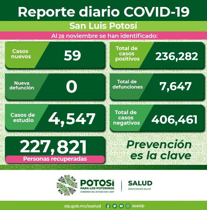 Se dan a conocer 59 nuevos contagios de Covid-19 en la Entidad, confirmando el Comité Estatal para la Seguridad en Salud y los Servicios de Salud 236 mil 282 casos totales de esta enfermedad.