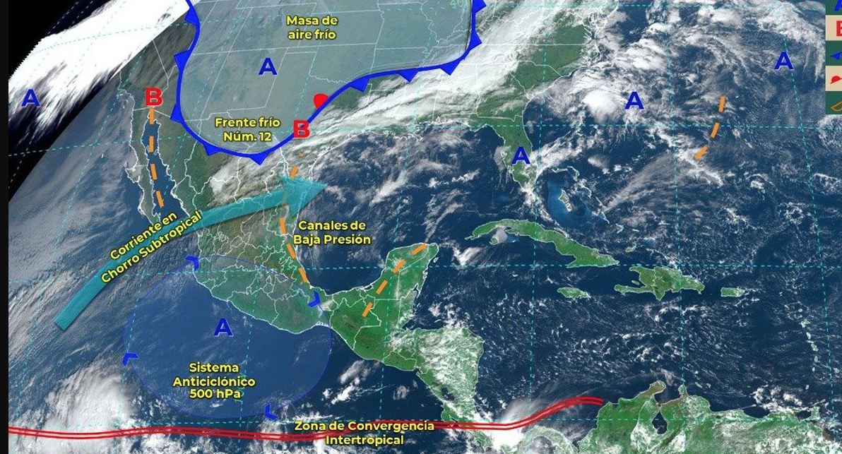 En horas de la noche de este día, se aproximará a la frontera norte de México un nuevo frente frío (Núm. 12), mismo que interaccionará con la corriente de chorro subtropical y ocasionarán fuertes rachas de viento en dicha región. Asimismo, reforzará el ambiente frío en zonas noroeste y norte de México.