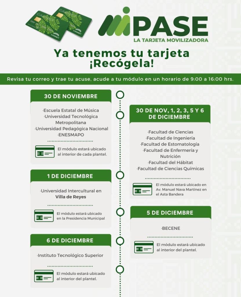 En cumplimiento al compromiso del Gobernador de San Luis Potosí, Ricardo Gallardo Cardona, de hacer realidad el transporte gratuito para estudiantes, la Secretaría de Comunicaciones y Transportes (SCT) entregará a partir de este miércoles 30 de noviembre más de nueve mil tarjetas “Mi Pase” a jóvenes universitarios de instituciones públicas de la zona metropolitana que se registraron exitosamente en la plataforma que habilitó el Gobierno del Estado.