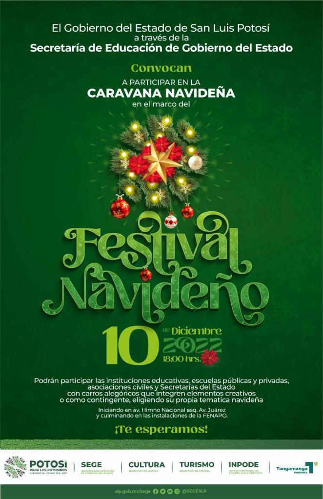 Luego del arranque del Festival Navideño en las instalaciones de la Feria Nacional Potosina (Fenapo), encabezado por el Gobernador de San Luis Potosí Ricardo Gallardo Cardona, la Secretaría de Educación de Gobierno del Estado (SEGE) coordina la primera “Caravana Navideña” que se llevará a cabo el sábado 10 de diciembre a las 18:00 horas, con la participación de alrededor de tres mil personas, para el disfrute de grandes y pequeños con un gran espectáculo.