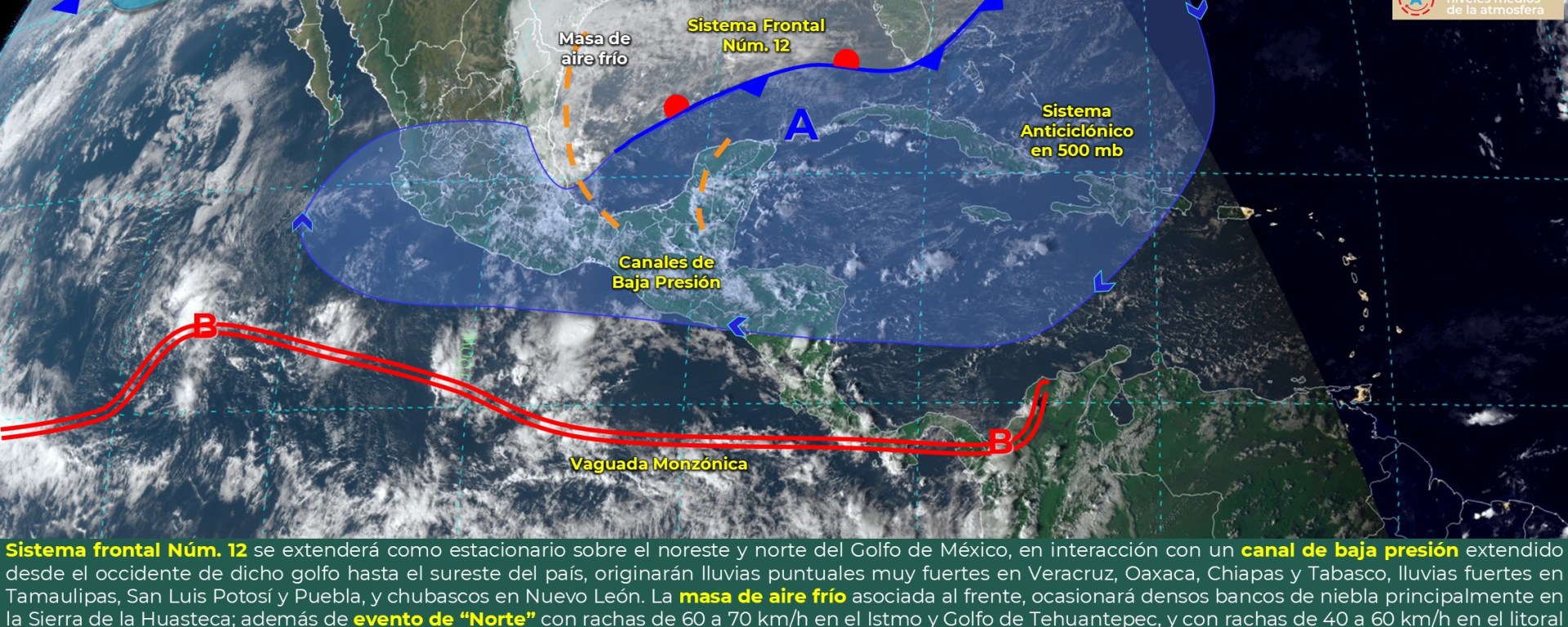 Viento de componente norte con rachas de 60 a 80 km/h: Istmo y Golfo de Tehuantepec, con olas de 1 a 3 metros de altura en dicho golfo.