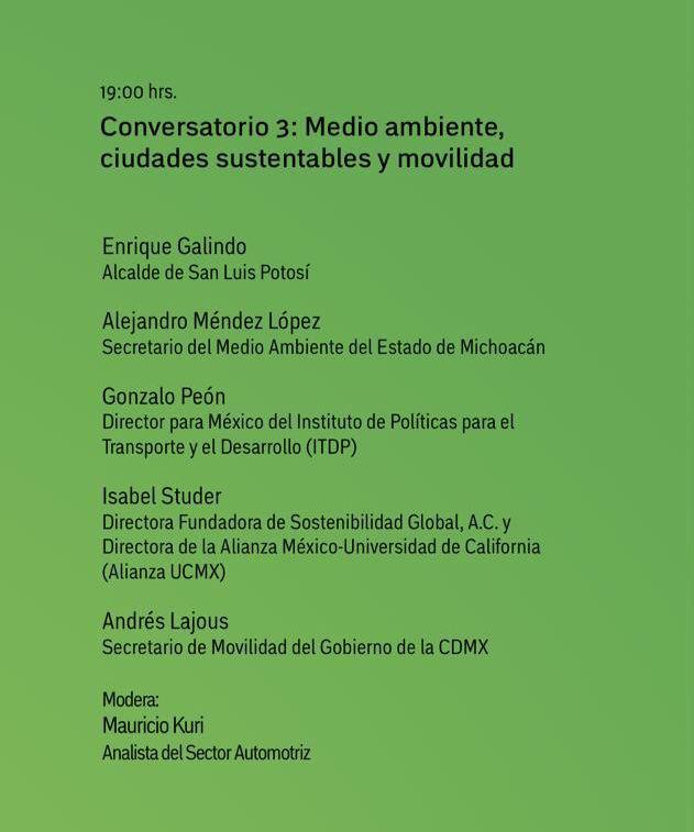 Junto al Alcalde Enrique Galindo Ceballos, en el conversatorio “Ciudades y movilidad sostenible: el futuro hoy” participaron Alejandro Méndez López, secretario del Medio ambiente de Michoacán; Andrés Lajous, secretario de Movilidad del Gobierno de la Ciudad de México; Isabel Studer, directora fundadora de la asociación Sostenibilidad Global y Gonzalo Peón, director para México del Instituto de Políticas para el Transporte y el Desarrollo.