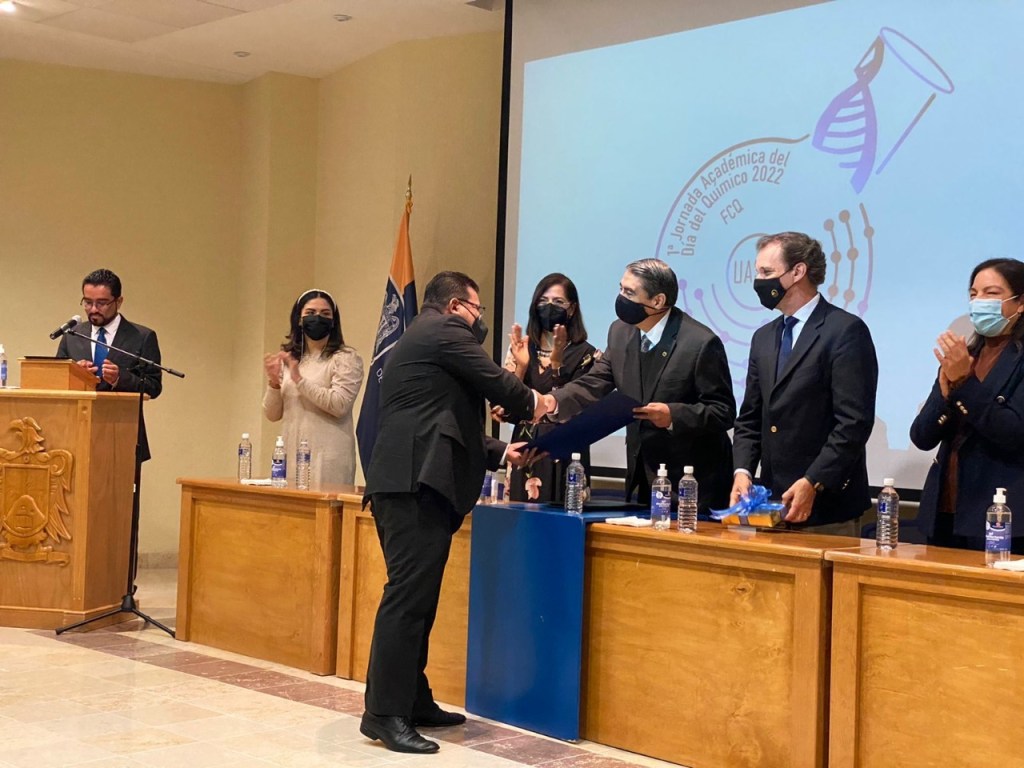 De igual manera, se entregaron reconocimientos a docentes de la Facultad. En la categoría de Docente Destacada de la FCQ 2022, a la M.C. María Esther Flores Moreno, obteniendo Mención Honorífica, la doctora Rosa del Carmen Milán Segovia; categoría Investigadora Asociada a la FCQ 2022, a la doctora Edith Elena Uresti Rivera; categoría Investigador Asociado a la FCQ 2022, al doctor Samuel Salazar García, mientras que en Mención Honorífica, recibió su reconocimiento el doctor César Fernando Azael Gómez Durán.