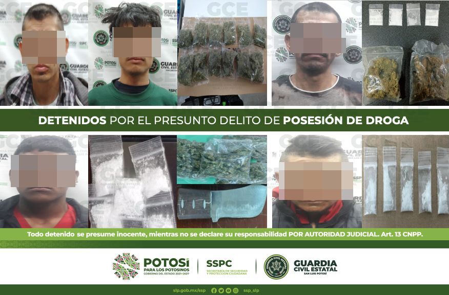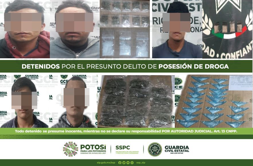 Como parte de las labores de inteligencia realizadas para combatir de manera frontal los hechos delictivos en territorio potosino, así como parte de las acciones dispuestas en el Plan Operativo “Otoño-Invierno 2022”, oficiales de la Guardia Civil Estatal (GCE) detuvieron a 9 personas por el presunto delito de posesión de droga.
