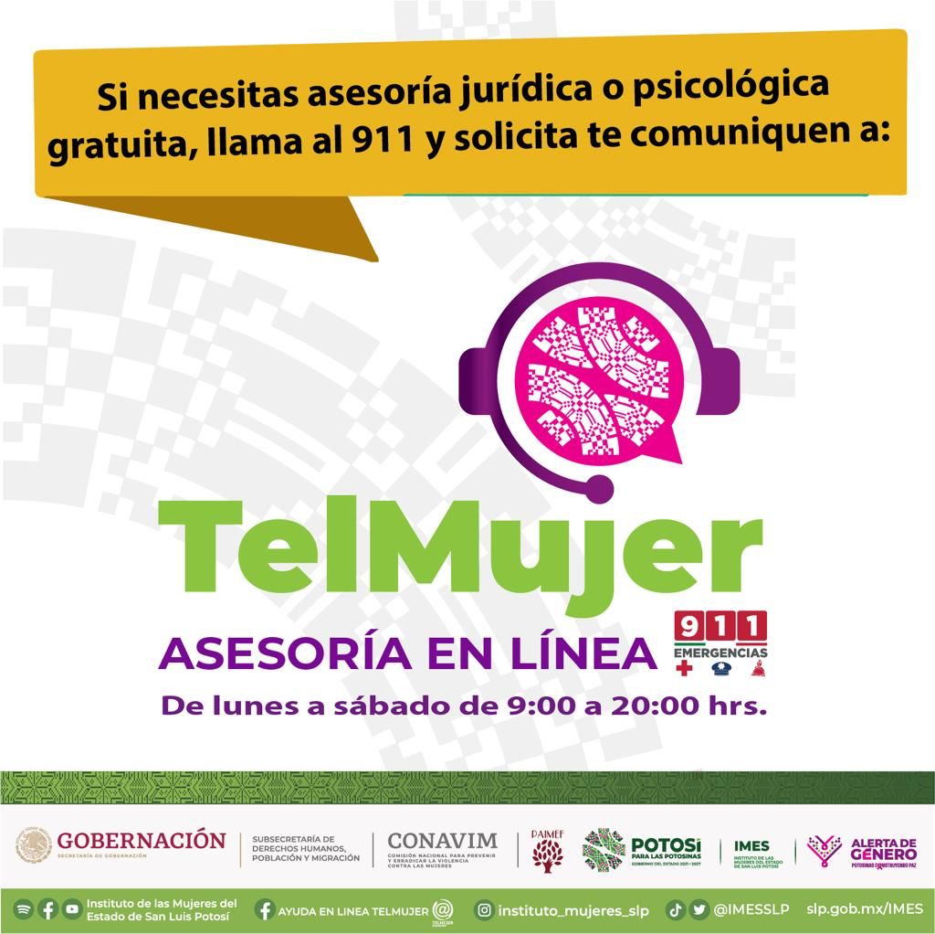 En atención a la estrategia del Gobernador de San Luis Potosí Ricardo Gallardo Cardona, de prevenir y erradicar todo tipo de violencia contra las potosinas, el Instituto de las Mujeres en el Estado (Imes) ofrecerá asesoría jurídica y atención psicológica a través de la línea telefónica #911 de TelMujer de manera confidencial y gratuita.