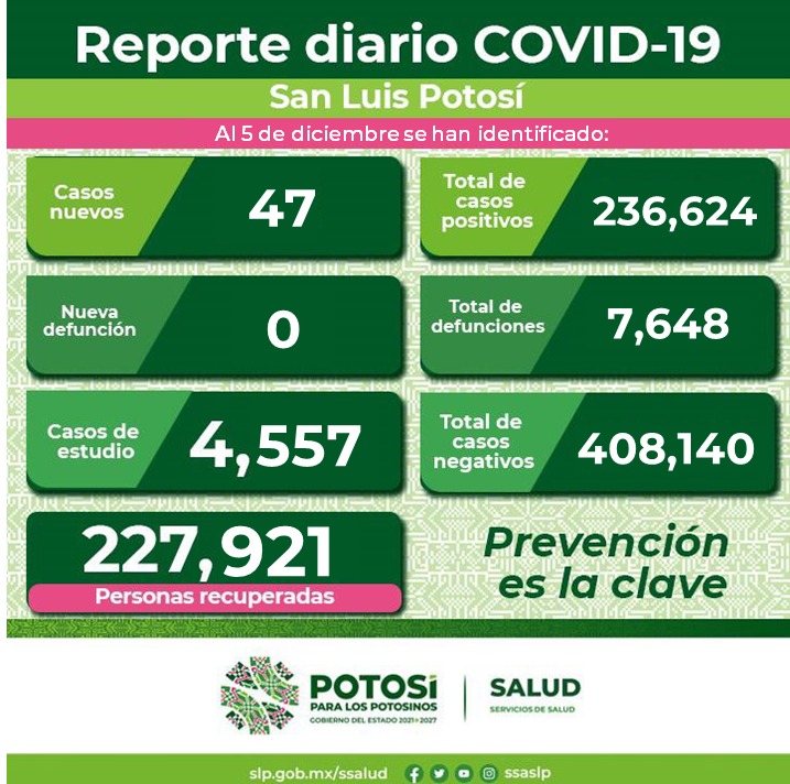 Se han confirmado 47 nuevos contagios de Covid-19 en el Estado, el Comité Estatal para la Seguridad en Salud y los Servicios de Salud, informan que, hasta este lunes 5 de diciembre, se registran 236 mil 624 casos totales de este padecimiento.