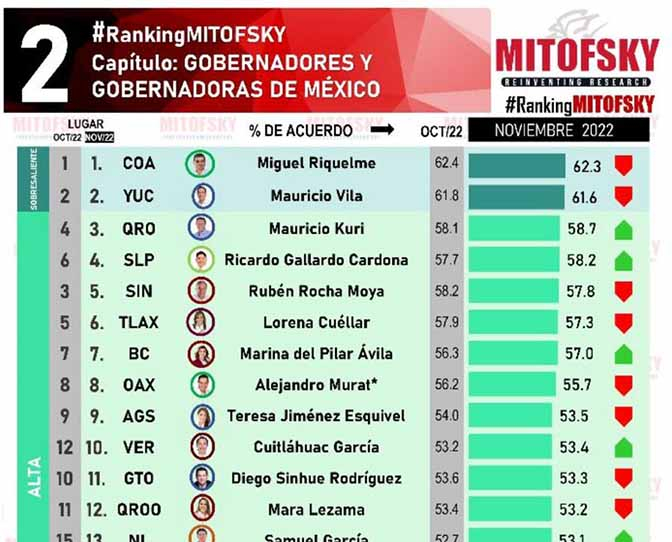Además, los resultados en la calificación global, lo ubicaron en la cuarta posición de la totalidad de las y los gobernadores, con Coahuila a la cabeza, seguido de Yucatán, Querétaro y San Luis Potosí, con apenas un ligero porcentaje por debajo de la calificación más alta que fue del 62.3 de aprobación ciudadana.