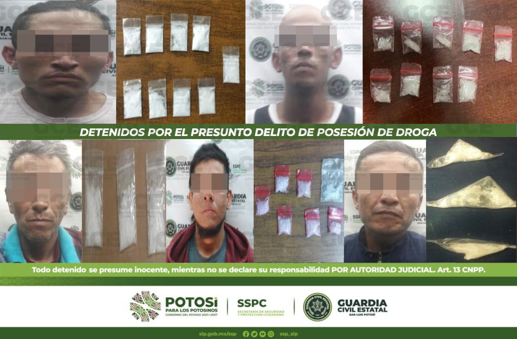La Guardia Civil Estatal (GCE) informa que mediante las acciones operativas con el propósito de reforzar la seguridad pública en la capital potosina, y dentro del marco de las estrategias preventivas trazadas en el Plan Operativo “Otoño-Invierno 20222, en distintos hechos, 5 personas fueron detenidas por presuntos delitos contra la salud en su modalidad de posesión de droga.