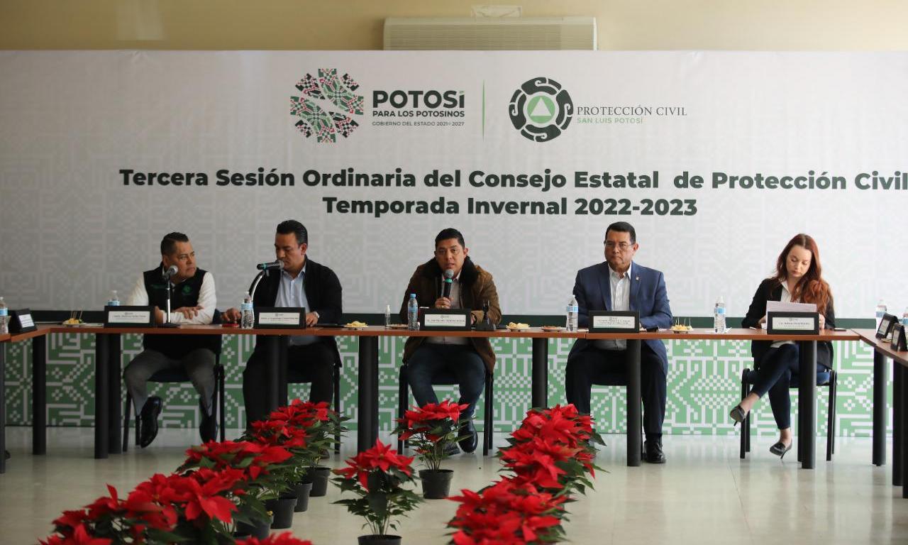 Con el fin de organizar, coordinar y operar las medidas y acciones de prevención, impulsando la gestión integral del riesgo y en su caso, mitigar los daños y afectaciones ante posibles emergencias o desastres, el Gobernador de San Luis Potosí, Ricardo Gallardo Cardona, encabezó este jueves, en su calidad de Presiente, la tercera sesión ordinaria del Consejo Estatal de Protección Civil, en donde fue presentado el Plan de Trabajo Operativo Invernal 2022 -2023.