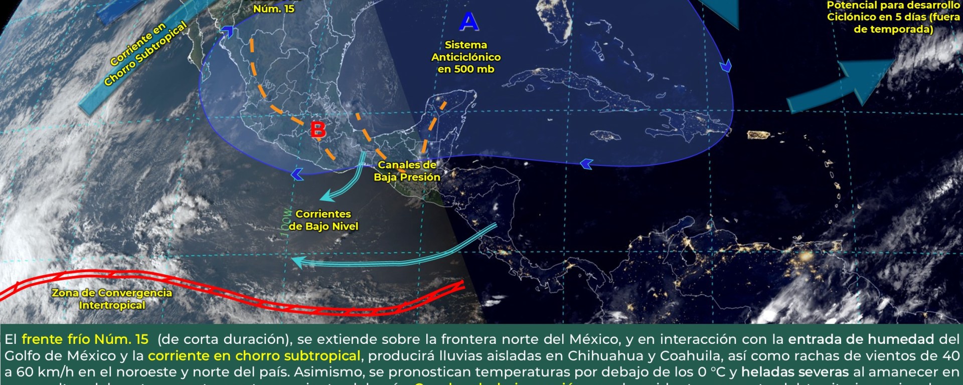 frente frío Núm. 15 (de corta duración) se extenderá sobre la frontera norte del México, y en interacción con la entrada de humedad del Golfo de México y la corriente en chorro subtropical, producirá lluvias aisladas en Chihuahua y Coahuila, así como rachas de vientos de 40 a 60 km/h en el noroeste y norte del país. Asimismo, se pronostican temperaturas por debajo de los 0 °C y heladas severas al amanecer en zonas altas del norte, noreste, centro y oriente del país. Por otra parte, canales de baja presión en el occidente y sureste del territorio nacional, en combinación con la entrada de aíre cálido y húmedo proveniente de ambos océanos, ocasionarán chubascos en Jalisco, Veracruz, Oaxaca, Tabasco, Campeche y Quintana Roo, con lluvias puntuales fuertes y descargas eléctricas en Chiapas.