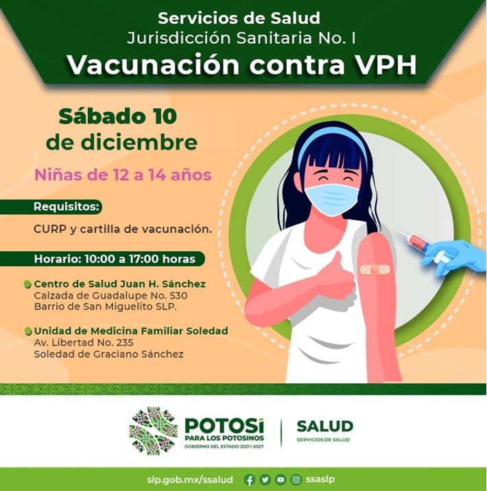Este sábado 10 de diciembre se vacunará en la Capital y el municipios de Soledad de Graciano Sánchez a niñas de 12 a 14 años contra el Virus del Papiloma Humano (VPH) en un horario de 10 de la mañana a cinco de la tarde y es indispensable acudir en compañía de una persona adulta, llevar CURP y cartilla de vacunación, indicó la jefa del Departamento de Vacunología de los Servicios de Salud en el Estado, Esmeralda Vanegas Santana.