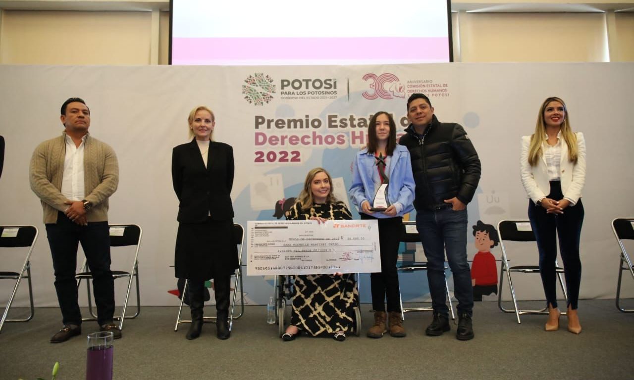 En la sala de usos múltiples del Museo Laberinto de las Ciencias y las Artes, el Jefe del Ejecutivo Estatal, entregó el Premio Estatal de Derechos Humanos 2022, a Sara Michelle Martínez Trejo, y reconocimiento de Mención Honorífica a Graciela Pérez García, junto a los ganadores del Primer Concurso de Dibujo y Pintura de Derechos Humanos con el tema “Derechos de las niñas, niños y adolescentes en San Luis”, cuyo certamen fue organizado por la Secretaría General de Gobierno.
