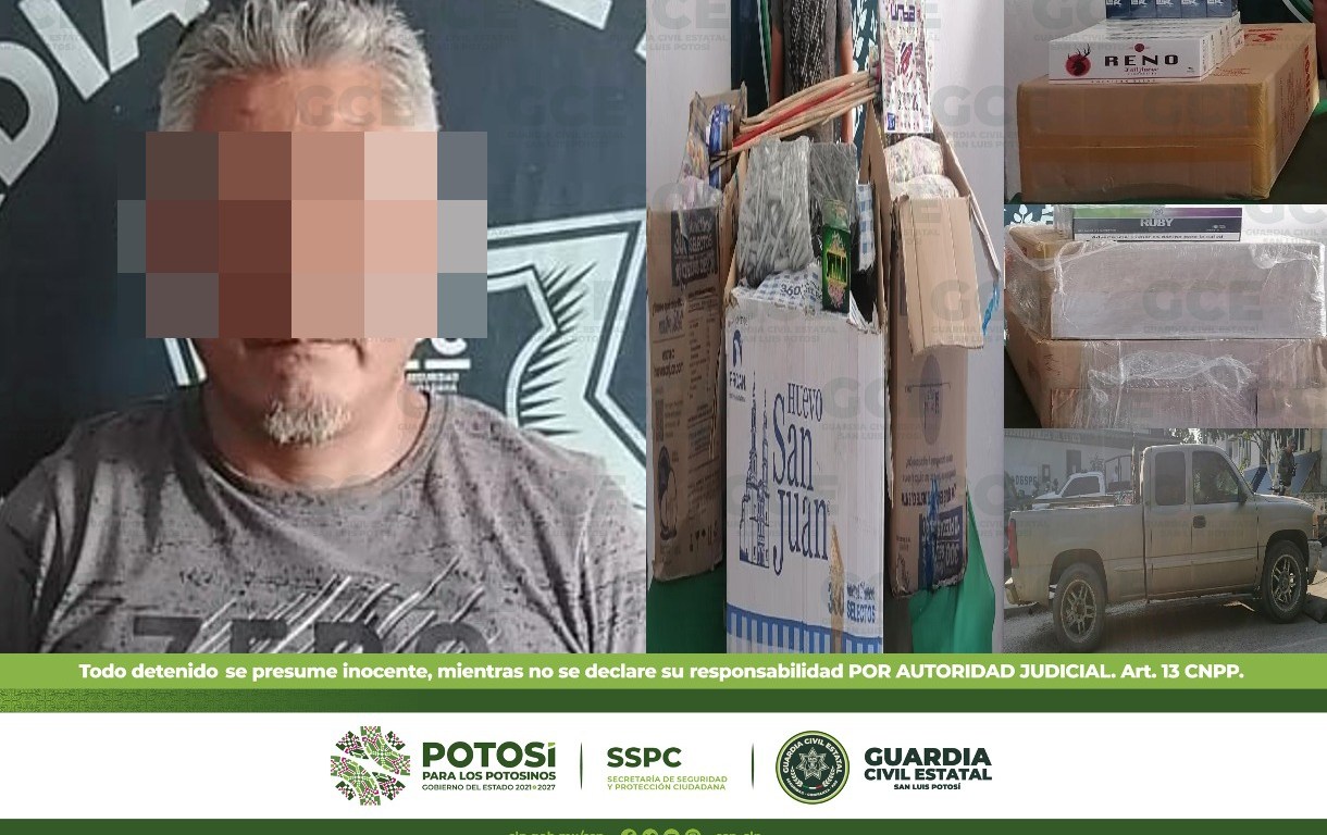 En el marco del Plan Operativo “Otoño-Invierno 2022” y como parte de las acciones preventivas encaminadas a inhibir actos constitutivos de delito, oficiales de la Guardia Civil Estatal (GCE) en coordinación con elementos de la Secretaría de la Defensa Nacional (SEDENA), Guardia Nacional y policía municipal de Tamuín, detuvieron a un hombre por la presunta posesión de alrededor de 68 kilos de pirotecnia sin medidas de seguridad y 45 kilos de cigarros apócrifos.